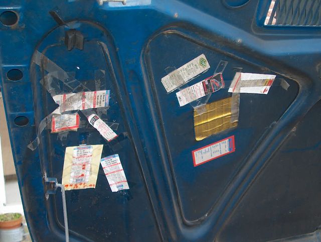 Op de binnenkant van de motorkap zijn de "bewijsstukken van